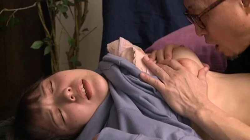3部シーン:近所に住む中年男性と。ベッドに押し倒され四つん這いに。指で這わすと既に濡れている。嫌だと言っても体は正直なえいみ。