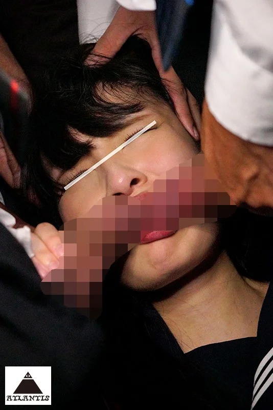 4人目:ショートボブ黒髪JK。3人の痴漢魔に体をまさぐられる。無理やり下着を脱がされて片足上げで手マン、マンコをかき回されて潮吹きしてしまう。